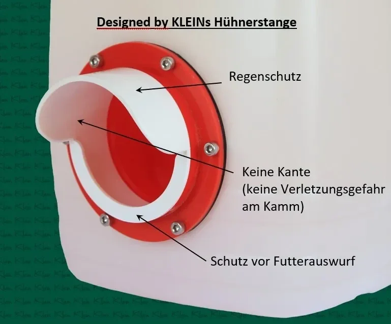 Der Futterspender wurde speziell von uns designed - ohne Kanten - , somit ist eine Verletzungsgefahr für den Hühnerkamm ausgeschlossen.