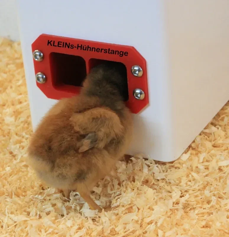 Dieser praktische Futterspender für Küken und Junghennen verfügt auf zwei gegenüberliegenden Seiten über unterschiedlich große Öffnungen.
