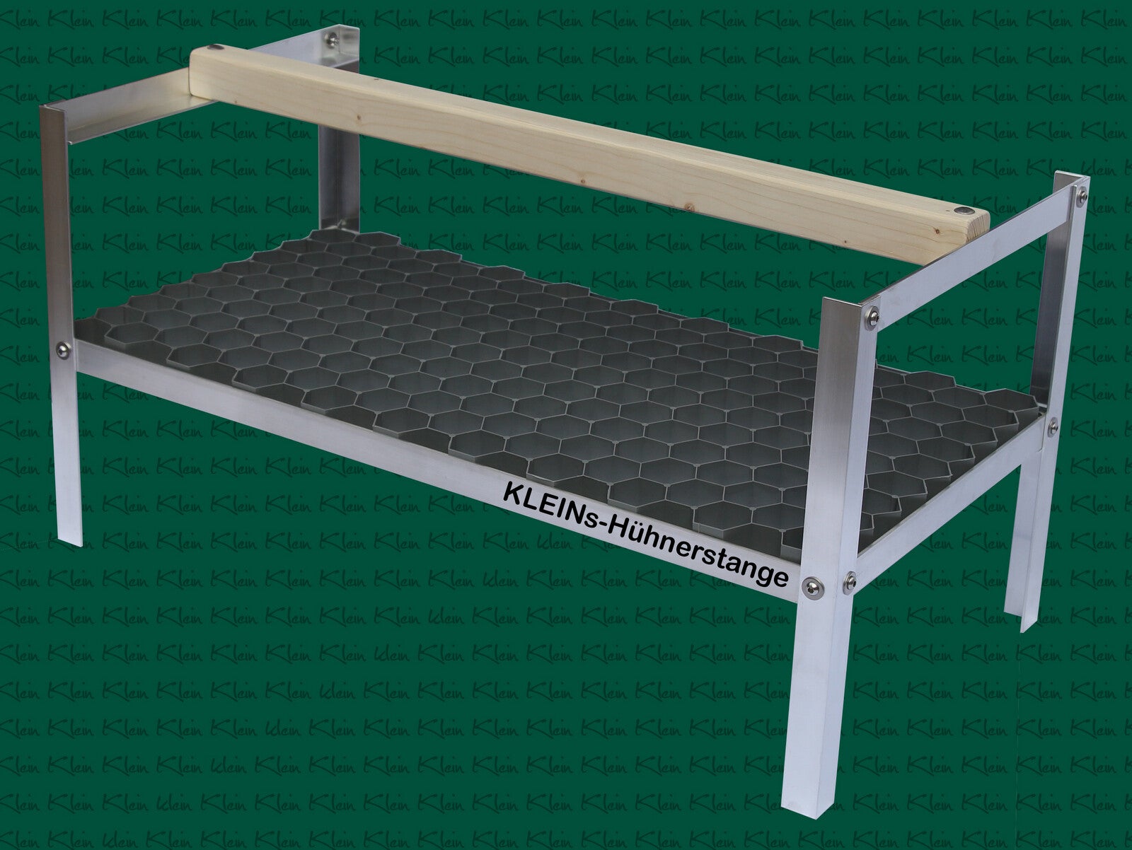 Die Hühnerstange ist fein geschliffen,unbehandelt und feststehend. Alle Schraubverbindungen sind aus Edelstahl. Dadurch ist das Gestell komplett rostfrei und aufgrund des Aluminiums sehr leicht und kann von einer Person getragen werden.
