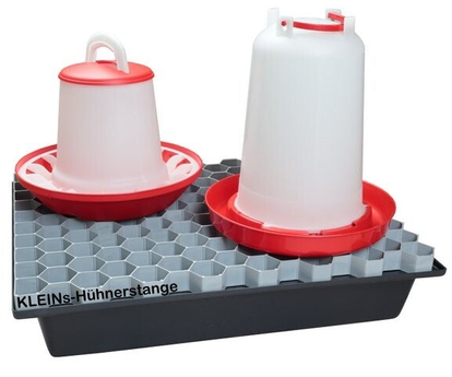Die Auffangwanne ist mit Waben abgedeckt, auf welche der Futterspender und die Tränke gestellt werden. Dadurch wird die Verunreinigung des Stalleinstreus, durch Futter und Wasser vermieden. Die Kunststoffwanne kann leicht gereinigt werden.
